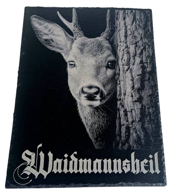 Gravierte Schiefertafel mit Rehbock-Motiv und "Waidmannsheil" – Das perfekte Geschenk für passionierte Jäger